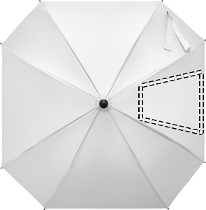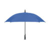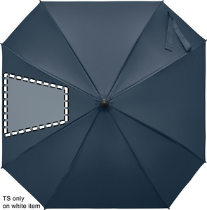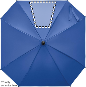 23-inch windproof auto-open square umbrella in 190T pongee polyester. Features full fibreglass frame and ribs, rubber-finished ABS handle.