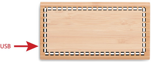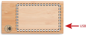 Wireless powerbank. 6000 mAh. Bamboo. Outputs: USB-A up to 10W. Wireless charging up to 5W. Input: USB-A 10W. 4 LED indicators. Built-in Micro USB plug. USB-A to Micro USB cable (30 cm) with USB-C adapter included.