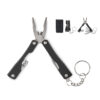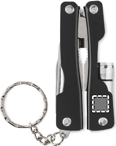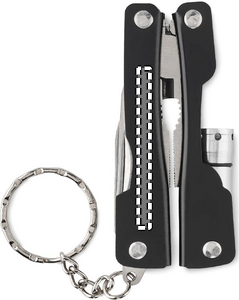 Foldable multi-tool knife with flashlight in stainless steel. Includes 10 tool functions including 600D polyester pouch. Including 3 x AG3 button cells.