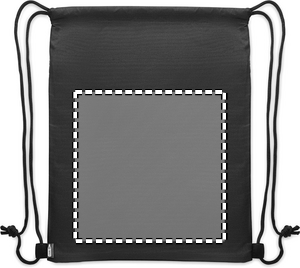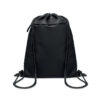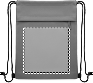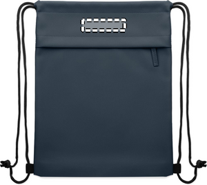 Drawstring bag with PU coated 600D RPET polyester and 190T RPET polyester lining. Zippered front pocket.