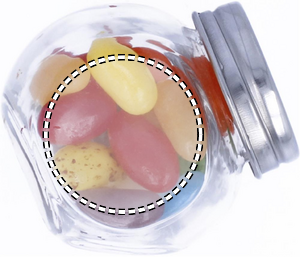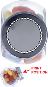 Multicolour jelly beans in a glass container jar with metallic cover. 40 grams candy.