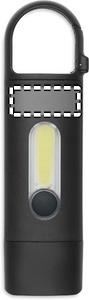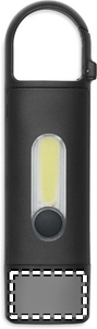 Pocket-size Rechargeable COB flash light with carabiner hook in ABS. Emergency light and 3 lighting modes. 1 × 3.7V, 200 mAh Lithium rechargeable battery (included, non-replaceable).