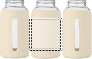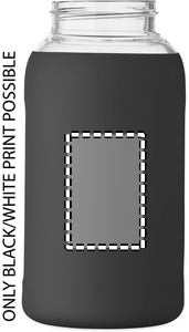 High borosilicate glass bottle with silicone pouch and PP lid with handle. Capacity: 600 ml