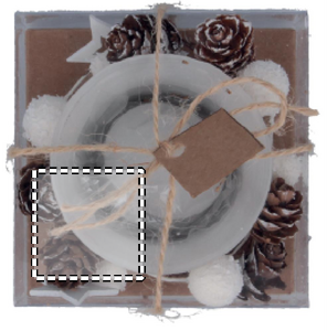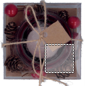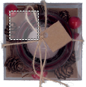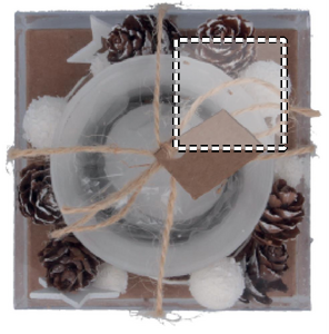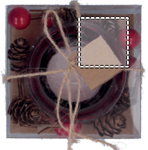 Glass candle holder surrounded via ornaments. Presented in a carton and PVC box with ribbon and label.