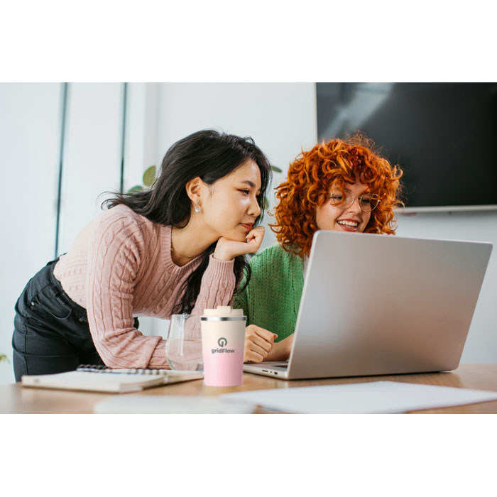 Double wall recycled stainless steel (90 % recycled stainless steel and 10% stainless steel) tumbler with PP lid. Capacity: 350 ml. Leak free.