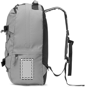 Backpack in high reflective 190T polyester with cord on front. Padded back, straps and bottom. It has 15 inch laptop compartment. One side mesh pocket and other side zippered pocket.