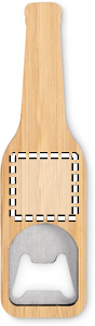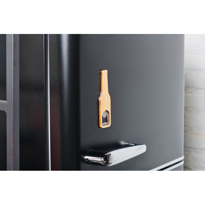 Magnetic bottle opener in stainless steel with bamboo surface.