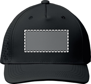 5 panel polyester performance cap with adjustable hook and loop closure and laser perforated holes with 2 stitched eyelets in matching colour. Item is quick dry, sweat and water repellent. 130 gr/m²