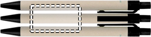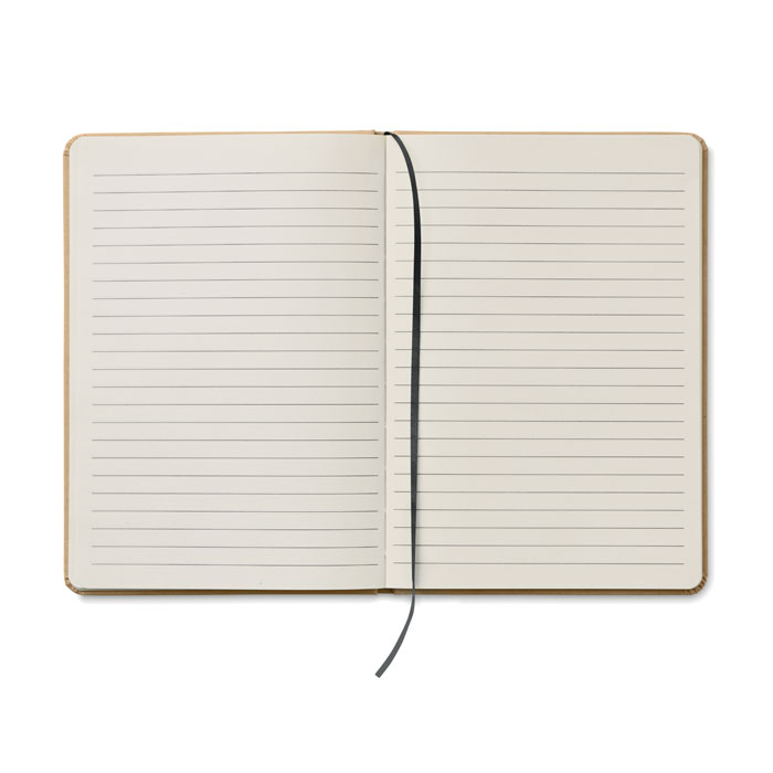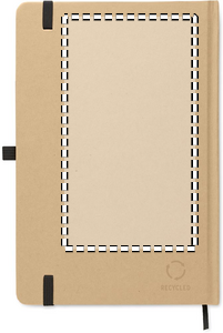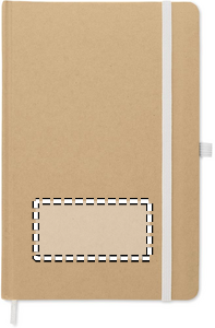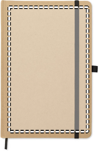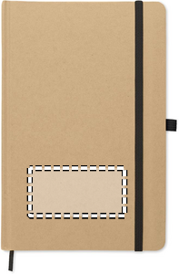 A5 notebook with hard recycled carton cover. Case bound. 160 lined pages (80 sheets recycled paper). Elastic closure strap and pen loop, ribbon bookmark. Includes push button ball pen with recycled paper barrel. Blue ink.