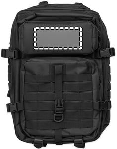 Outdoor 50L backpack in 600D RPET with padded laptop compartment and several inner compartments, zip front pockets, mesh padded straps and back, hip belt, and elastic supports for accessories.