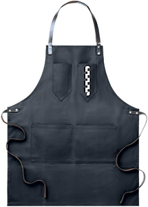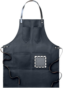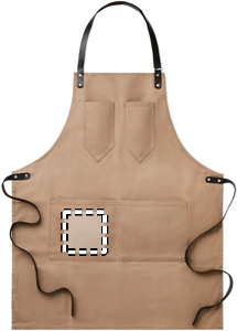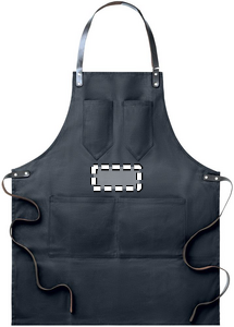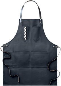 Apron in waxed canvas with leather details, adjustable strap with 2 chest pockets and 1 large low level pocket. 12oz Waxed Canvas.
