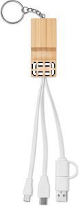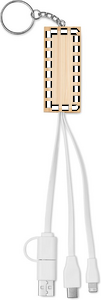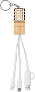 Bamboo key ring with phone stand functionality and integrated charging cable. Input: 2-in-1 Type-C <(>&<)> Type-A. Output: Type-C and micro-B (2 in 1 pin).