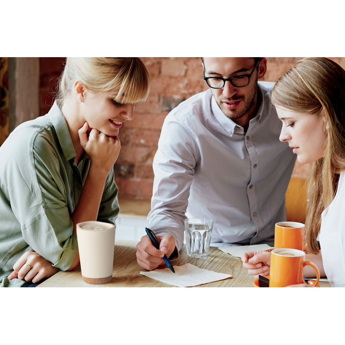 Double wall tumbler in PP with cork base and slide closing drinking mouthpiece lid in PS and ABS. Capacity: 300 ml.