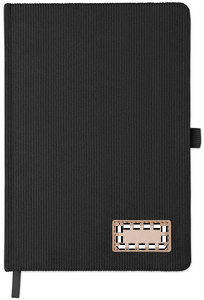 A5 notebook with hard RPET polyester corduroy cover and 192 lined recycled paper pages (70 gr/m2). Casebound design with elastic band closure, pen loop, ribbon page marker, and washed kraft paper tag.