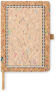 A5 notebook with hard coloured cork cover. Case bound. 192 lined paper (96 sheets). Elastic closure strap, ribbon bookmark and elastic pen holder.