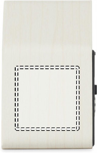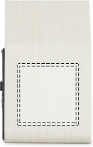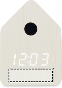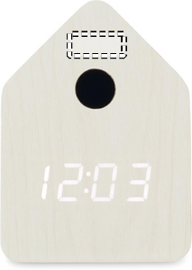 Small MDF desk clock including a built-in alarm with bird cuckoo voice and temperature display. Bird cuckoo voice every full hour and during alarm. White LED display. Sound is automatically silenced between 22.00h to 06.00h. 5 mins snooze intervals