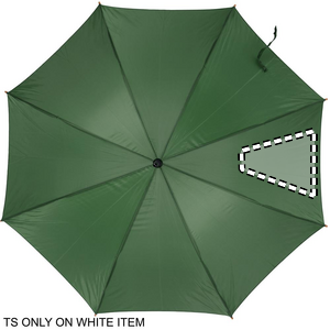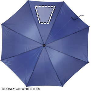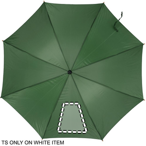 23 inch auto open umbrella in 190T polyester with wooden shaft, tips and top. Black plated metal ribs. Curved natural finish wooden handle.