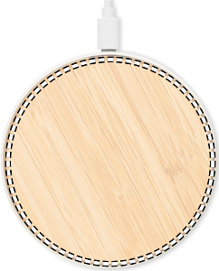 Wireless charger 10W in bamboo top and ABS base. Connect device to your computer, place smartphone on it and let it charge. Output: DC 9V/1.10A (10W) for quick charging. Compatible with latest Androids, iPhone® 8, X and newer. Connect the device to your computer or other power source. Place your smartphone on it and the charging will start. The combination of ABS plastic and natural bamboo gives this charger a stylish look and makes it a sustainable choice. Bamboo is a natural product, there may be slight variations in colour and size per item, which can affect the final decoration outcome.