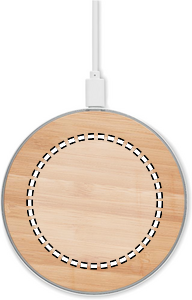 Wireless quick charger in bamboo and aluminium. Blue light lit when charging. Output: DC9V/1.1A (10W). Bamboo is a natural product, there may be slight variations in colour and size per item, which can affect the final decoration outcome.