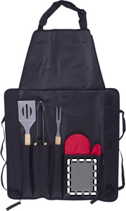 BBQ apron with three different BBQ tools and one glove. Apron in 600D polyester.
