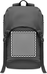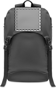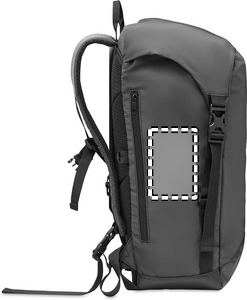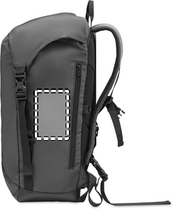 Outdoor backpack in 190T polyester coated with reflective granules. Side zippered outer pocket and padded back, inner lining with drawcord closure. One large padded inner laptop compartment. It has adjustable padded shoulder straps and adjustable chest and waist strap with buckle closure. Water repellent.