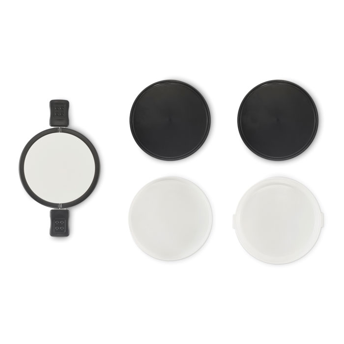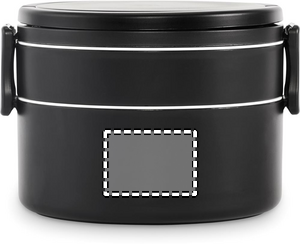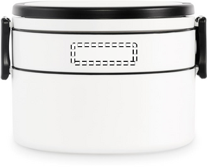Two-tier round lunch box made of PP with side clip closure and handles. Includes inner lids. Capacity 250 ml top, 700 ml bottom.