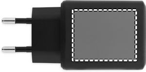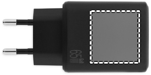 EU 2-pole GaN wall charger with 65W quick charge, 1 USB-A and 1 Type-C ports. Supports Power Delivery technology. Ideal travel item.
