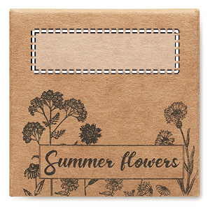 Pressed peat disc with mixed summer flower seeds presented in carton box. Made in EU.