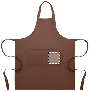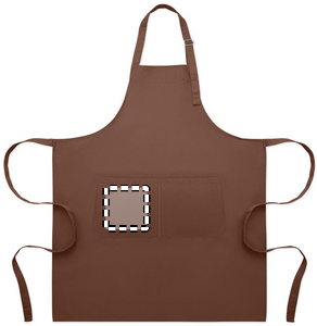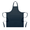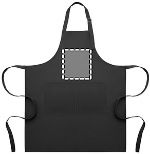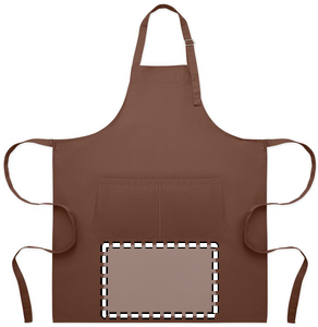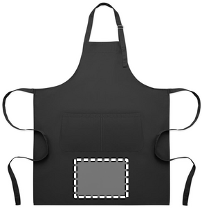 Long adjustable kitchen apron in 240 gr/m² polycotton (35% cotton, 65% polyester) with two front pockets and adjustable strap with metal buckle.