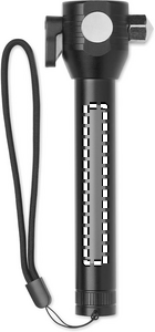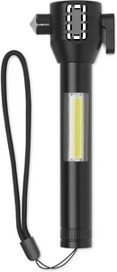 3 in 1 aluminium torch with emergency hammer and seat belt cutter. It has a COB light on side and front. Including magnet and hand strap. Built-in rechargeable 500mAh battery included.
