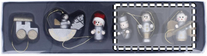 Set of 6 wooden Christmas tree hangers presented in a cardboard box with clear lid.