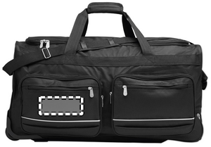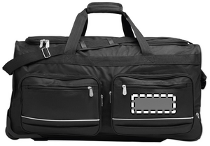 Soft duffle bag trolley in 600D RPET. Zippered front pocket. Two side slip pockets. Three inner pockets. Padded shoulder straps. 2 wheels and double tube frame.