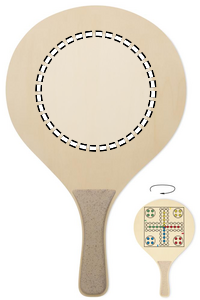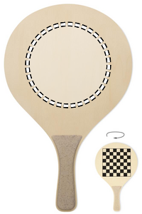 Beach set with 2 plywood rackets featuring a chess and ludo game boards. Includes 1 TPR ball, dice and checkers. Packed in RPET mesh zippered carrier bag.