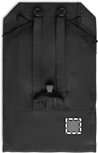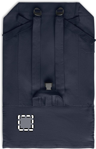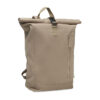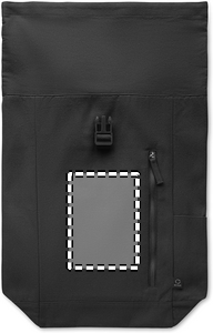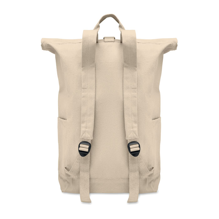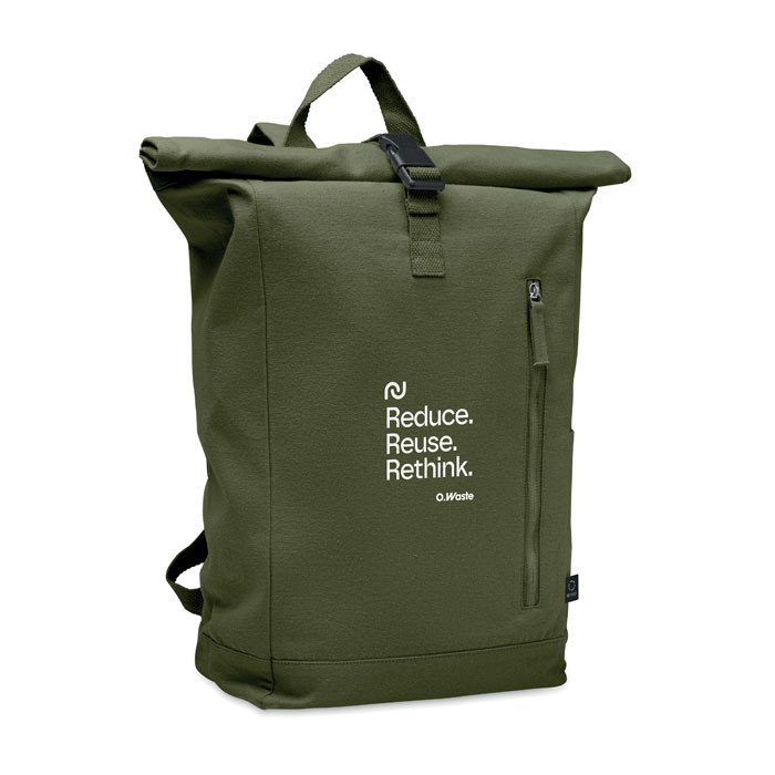 Roll top backpack with hook and loop closure in 390 gr/m² recycled cotton (80%) and recycled polyester (20%). Zippered front pocket.