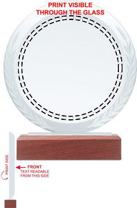Round crystal award or memorial plaque on a beech wooden base in a gift box. Surprise a special someone with a customized crystal trophy. The beech wood gives the award a natural look that will definitely catch attention. Wood is a natural product, there may be slight variations in colour and size per item, which can affect the final decoration outcome.