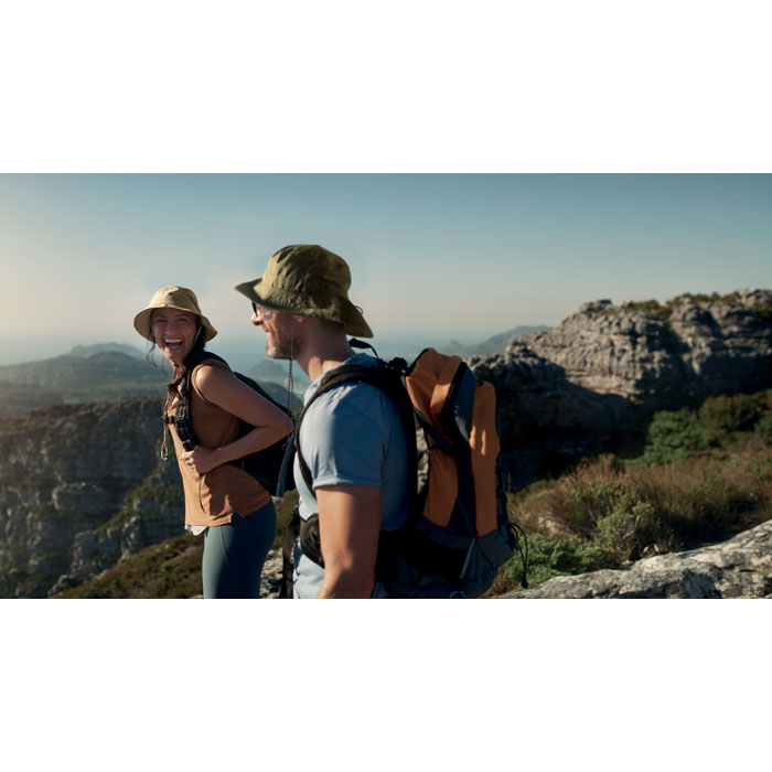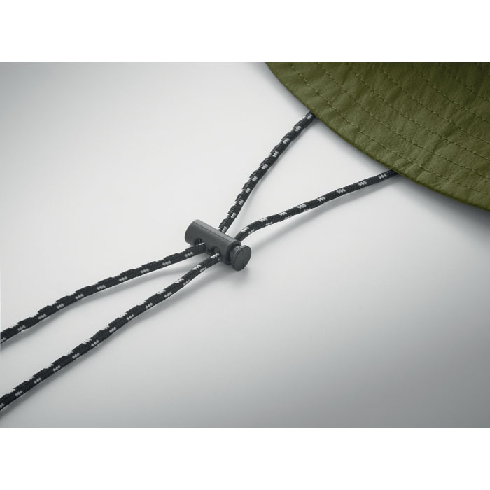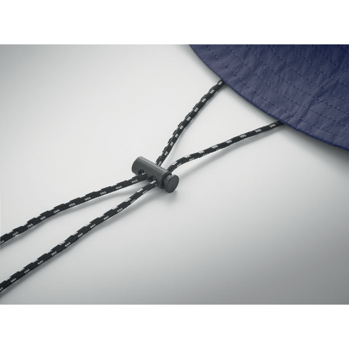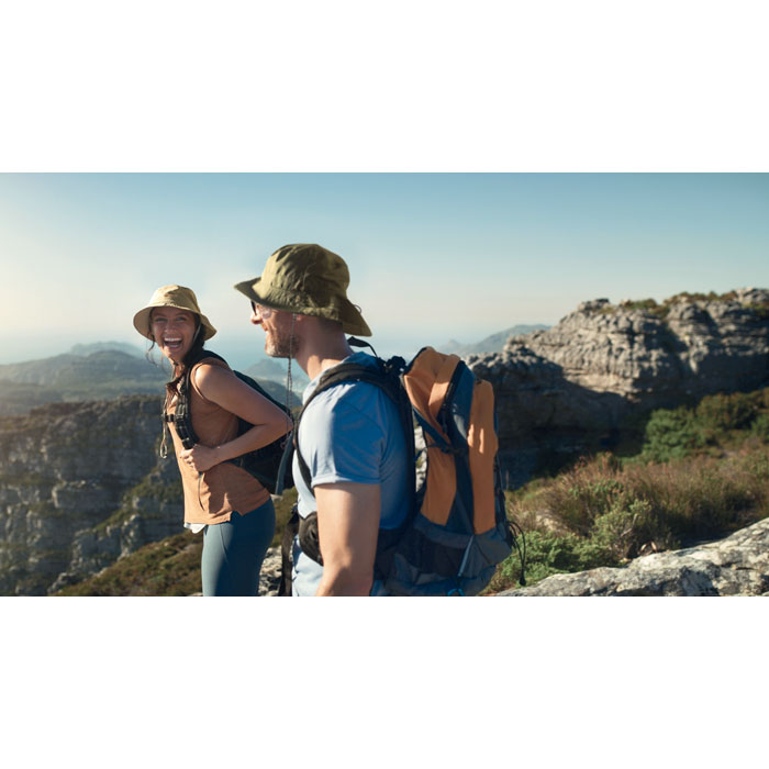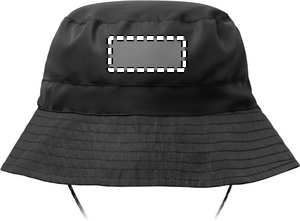 Water repellent fisherman hat made of polyester, includes self material pouch with ABS carabiner. 64 gr/m².