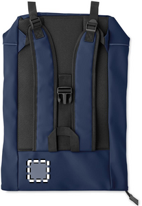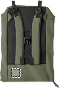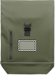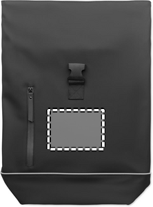 15 inch roll top laptop backpack in soft PU with padded back and base reinforcement with reflective strip. Waterproof zippered front pocket. 210D RPET polyester lining.