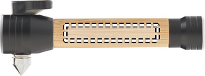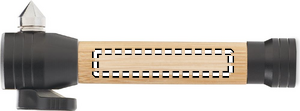3 in 1 bamboo torch with emergency hammer and seat belt cutter. It has a magnetic base. Output lumen: 60. 2 AAA batteries excluded. Bamboo is a natural product, there may be slight variations in colour and size per item, which can affect the final decoration outcome.