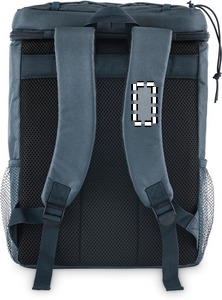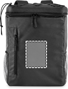 Cooler backpack in 600D RPET polyester with padded adjustable shoulder straps, PEVA lining, and 5mm PE foam. Includes front pocket and two side mesh pockets. Capacity: 9L.