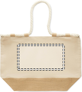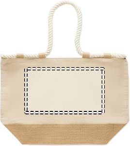 Beach bag in 280 gr/m² cotton canvas and jute with cord handles. Features zipper closure, jute-covered bottom and 10 jute loops.