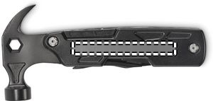 14-in-1 stainless steel multi tool hammer. With nail puller, hex wrench, serrated knife, steel file, variety of screwdrivers, regular pliers, needle-nose pliers, bottle opener, knife, wire cutter.