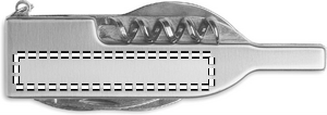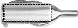 Stainless steel wine bottle shaped pocket knife with 6 functions: bottle opener, knife, corkscrew, foil cutter, magnifying glass and key ring.