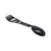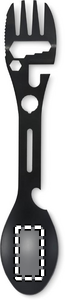Stainless steel multi tool cutlery. Tools includes spoon, fork, adjustable wrench, bottle opener, hex key, serrated knife, opener and positioning wrench.