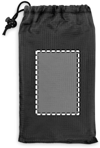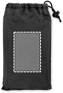 Lightweight beach mat in 210T polyester measuring 200x210cm. Includes 4 black hooks and a matching drawstring pouch for easy carrying.