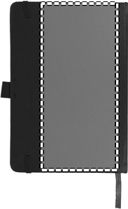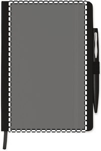 A5 notebook with pen. Hard PU cover. Casebound. 144 lined pages (72 sheets). Matching elastic closure strap, ribbon bookmark and pen holder. Matching metal push button ball pen. Blue ink. FSC MIX CREDIT | P7.1 | FSC-C213206