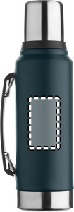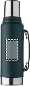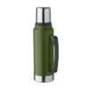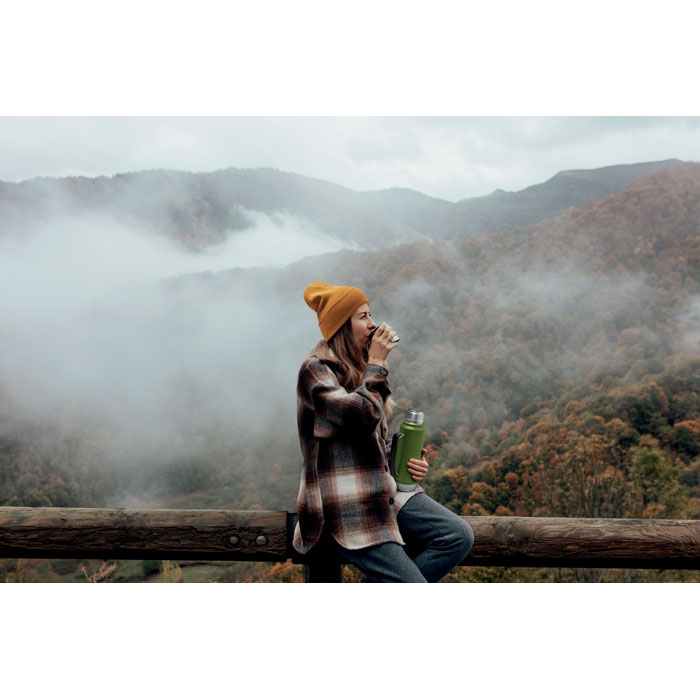 Double wall vacuum insulating bottle in recycled stainless steel (90% recycled stainless steel and 10% stainless steel) with handle on side. With PP lid and recycled stainless steel cup. Leak-free. Capacity: 1L.