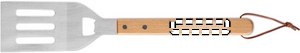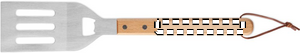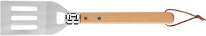 Stainless steel BBQ spatula with beechwood handle and integrated bottle opener. Includes PU rope hanger for easy storage.