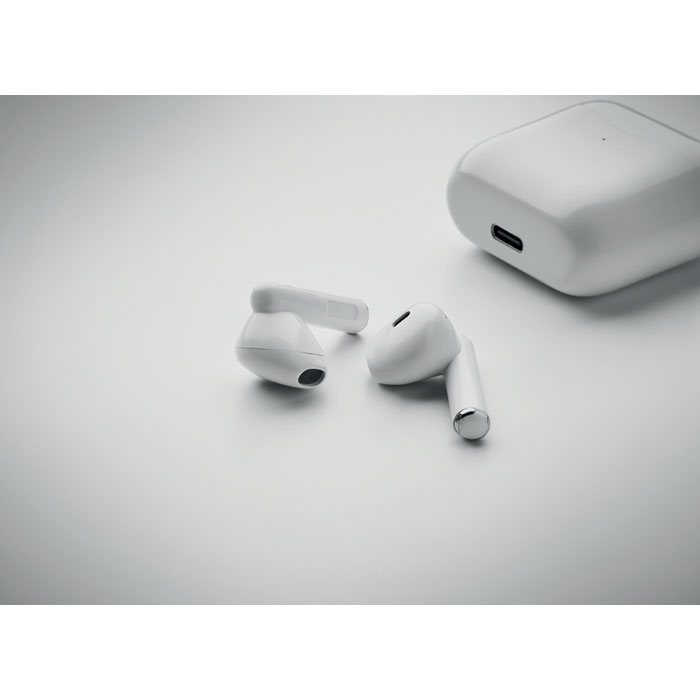 ABS True Wireless Stereo (TWS) 5.3 wireless stereo earphones with microphone and 30 mAh build-ion battery and 200 mAh charging box. Playing time approx. 4 hours. Auto-pairing.