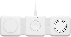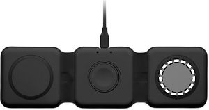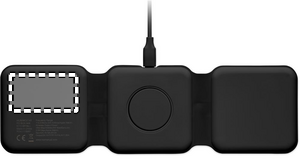 3 in 1 foldable charging station in ABS. It has 3 wireless charging spots (15W). Input: 2-in-1 Type-C and Type-A.