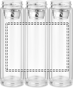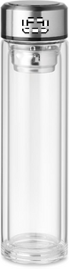 This double wall borosilicate glass bottle can hold both hot and cold drinks. Unlike regular glass, this will not crack under extreme temperature changes. On the inside is a removable tea infuser/strainer to help infuse the water with your favourite fruit flavour or tea. The top of the lid has a built-in LED touch thermometer that shows the current temperature of the liquid inside. Never burn your lips on hot tea again with this bottle. Take this bottle with you wherever you go. It is leakproof, so you will have no trouble carrying it in your bag. 1 CR2032 battery included. Capacity: 390ml. Laser engraving is not possible on borosilicate glass.